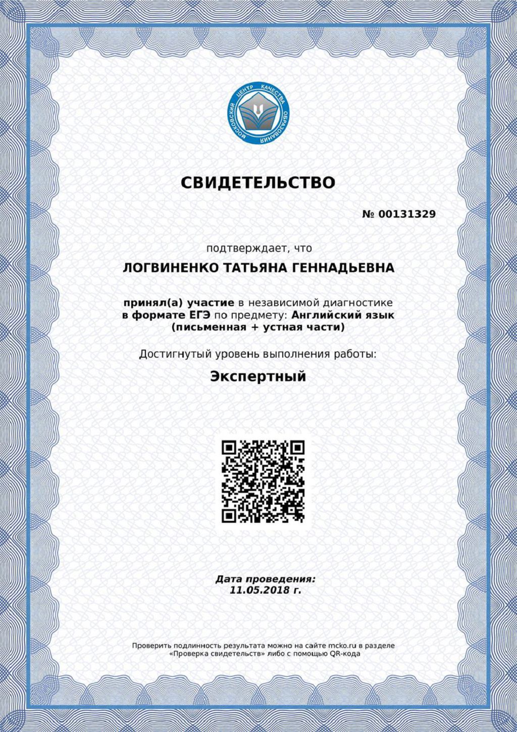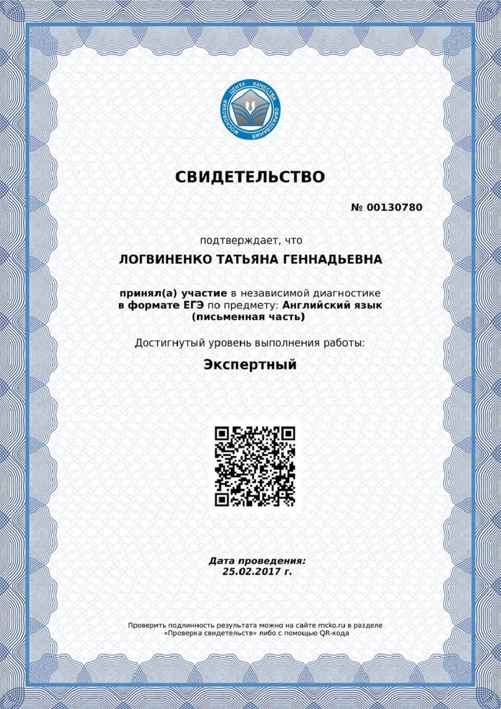 Специальность: «филолог, преподаватель английского языка и литературы», второй иностранный язык – китайский.