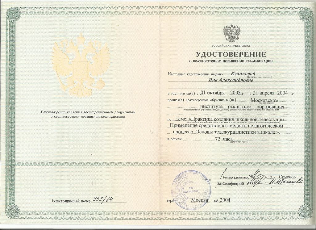 - В 2004 году прошла обучение в Московском институте открытого образования по теме: «Практика создания школьной телестудии.