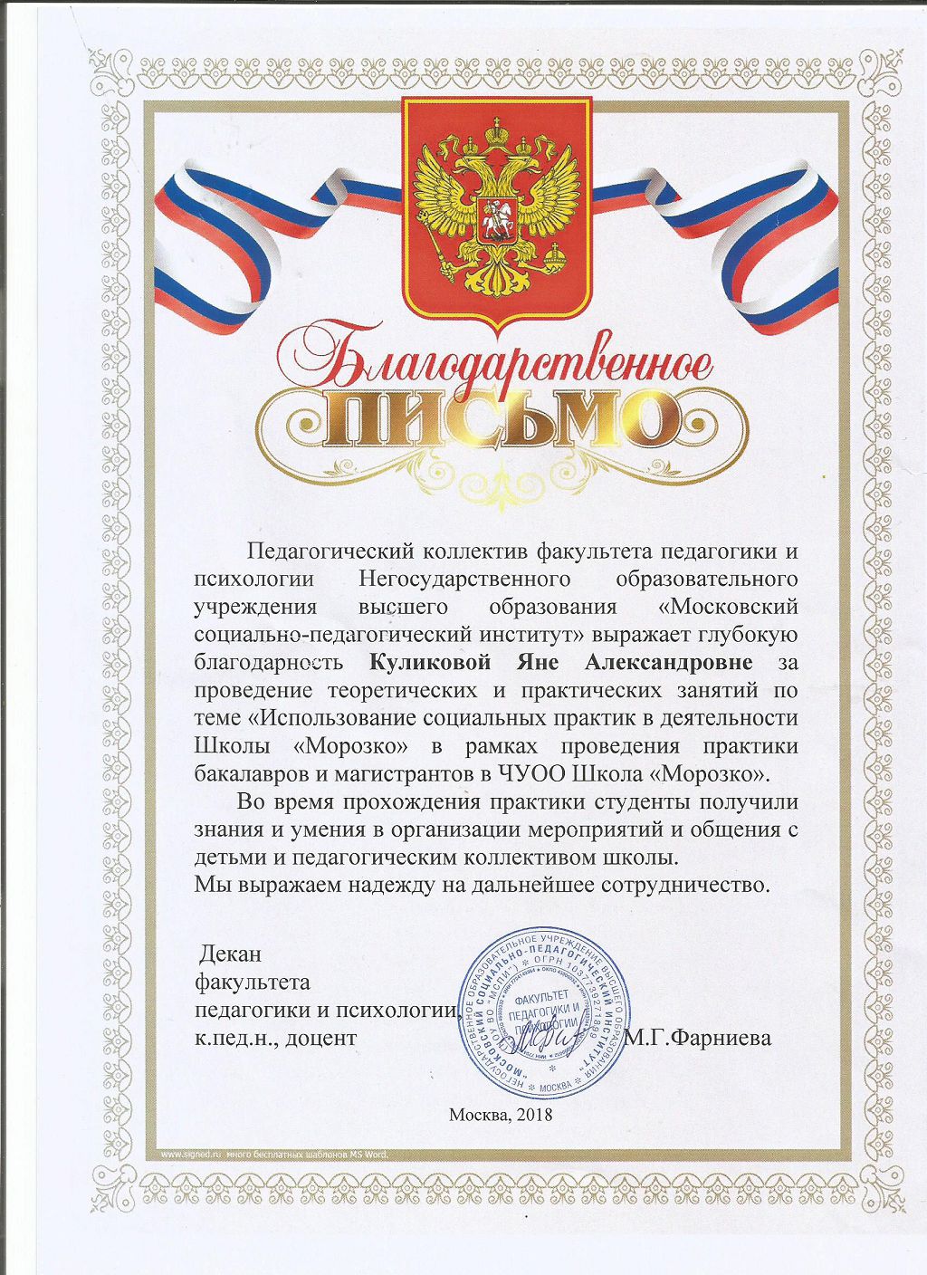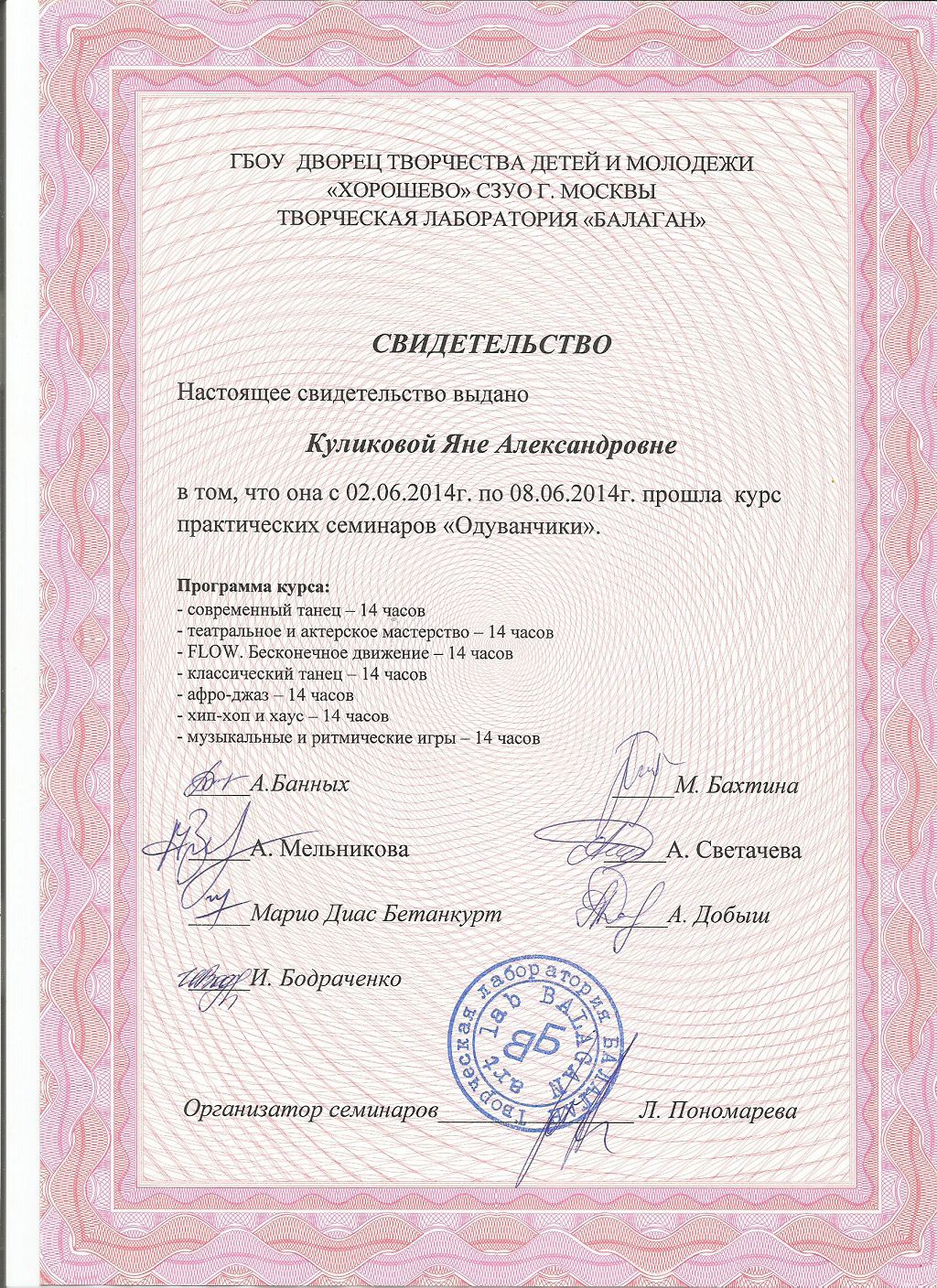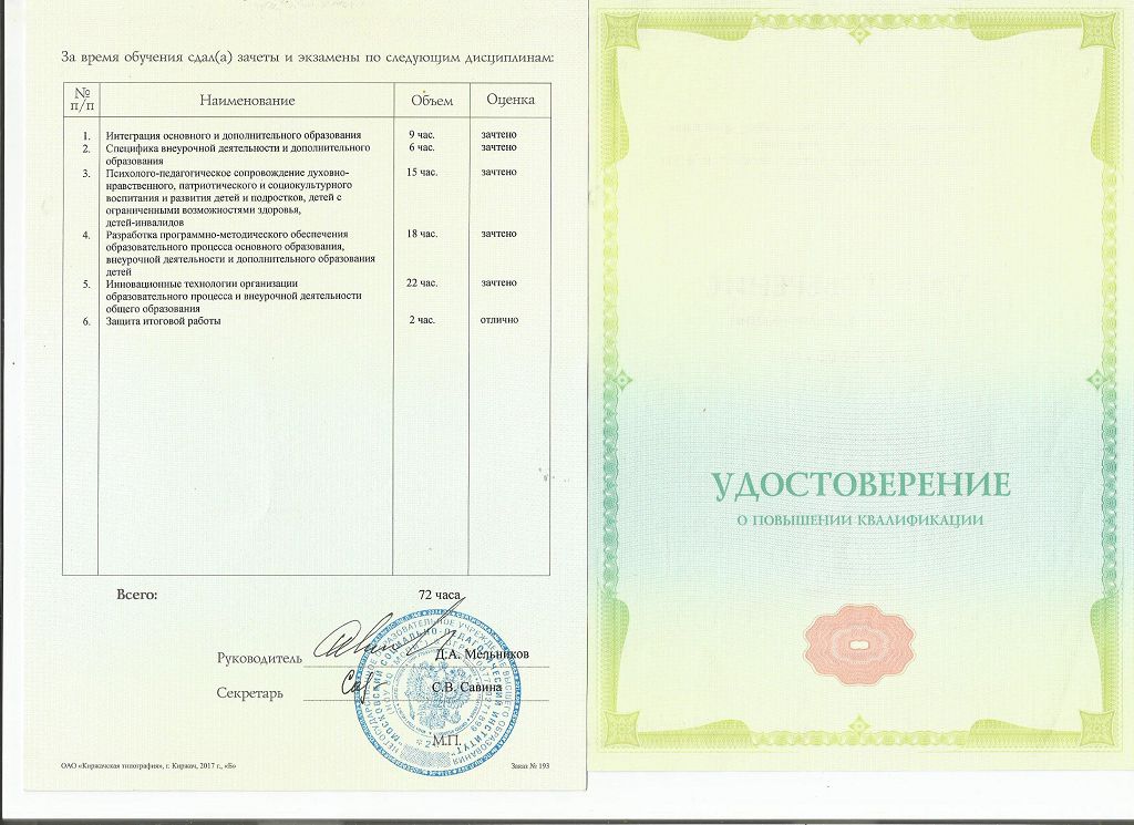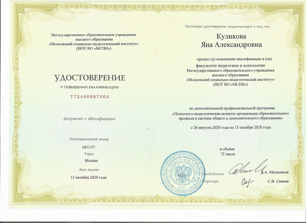 - 2020 году прошла обучение в Московском социально-педагогическом институте по дополнительной профессиональной программе