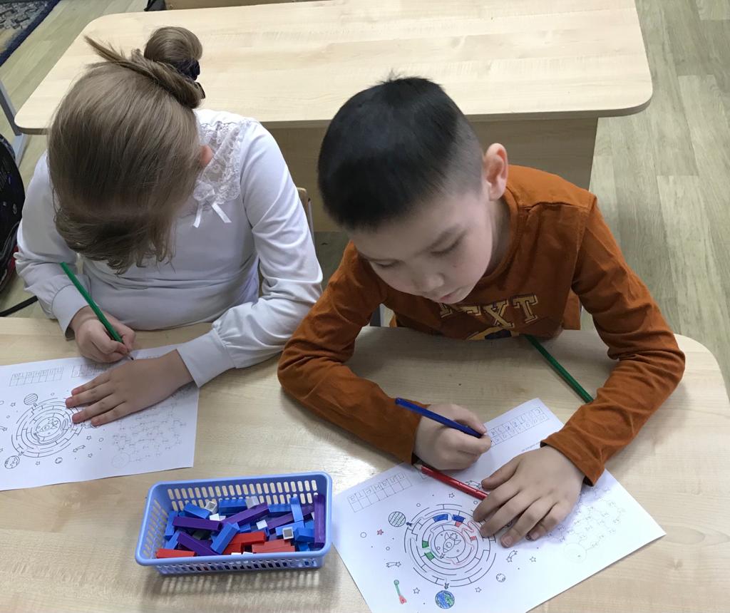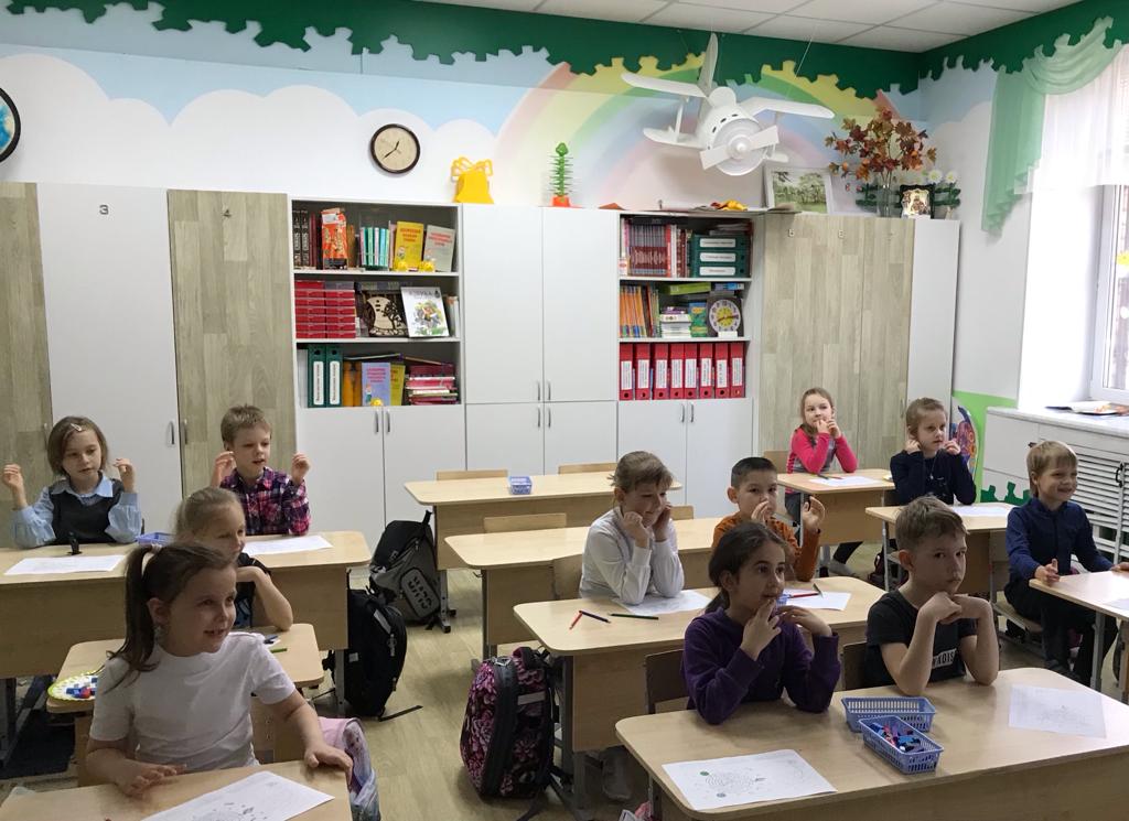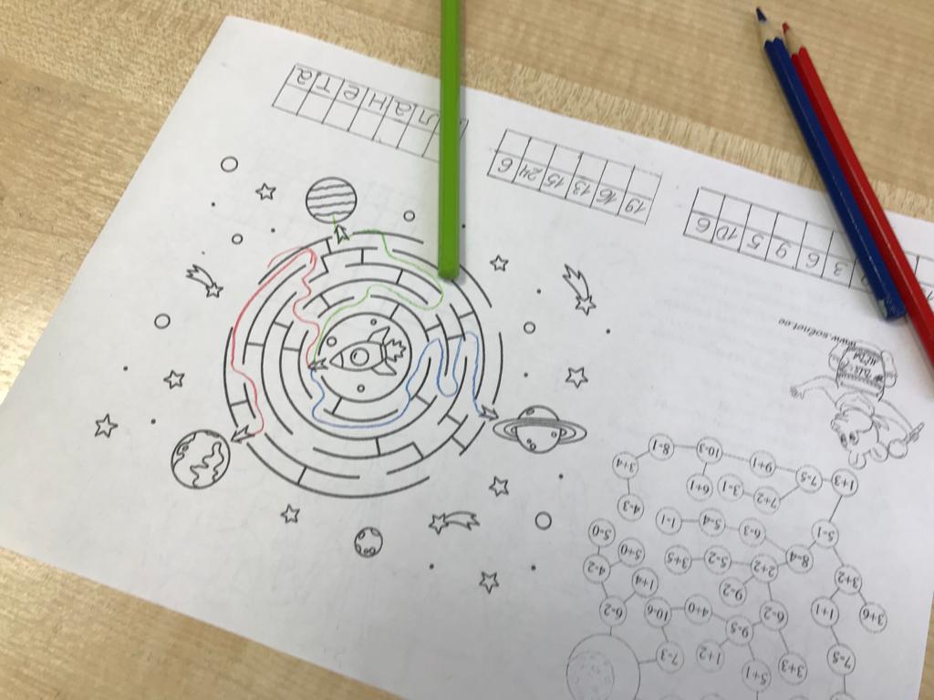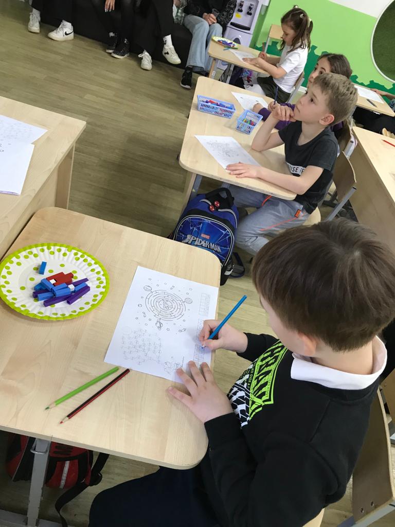 Первоклассники на уроке выполняли задания с лабиринтами, решали примеры и задачи, разгадывали загадки, находили отличия в картинках, выполняли кодировку.