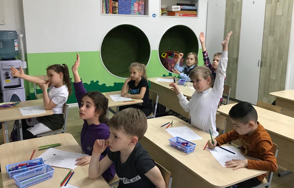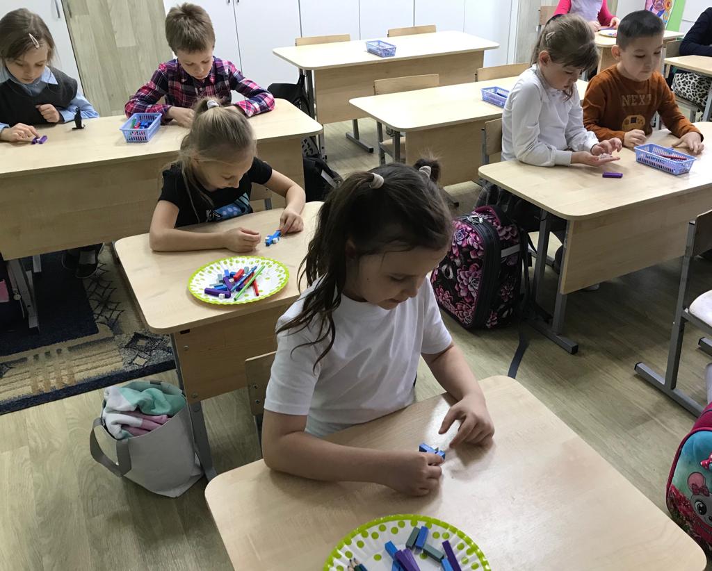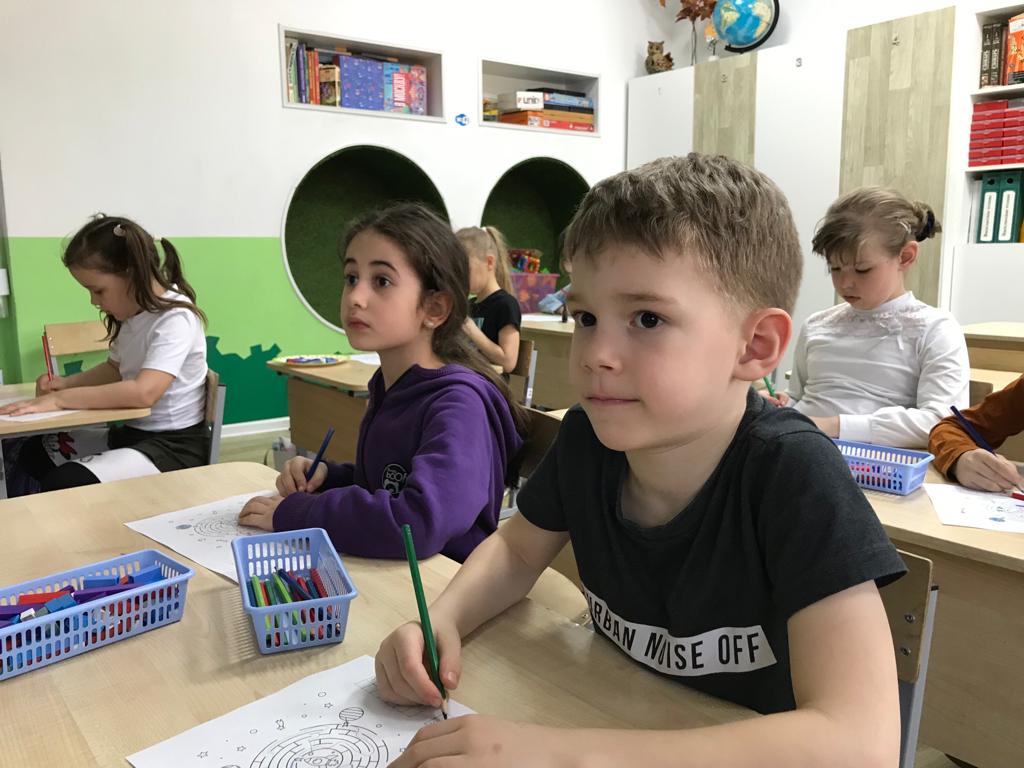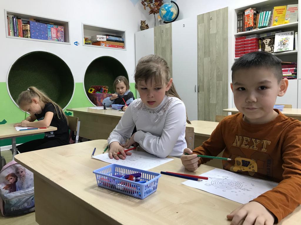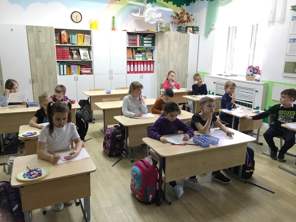 Первоклассники на уроке выполняли задания с лабиринтами, решали примеры и задачи, разгадывали загадки, находили отличия в картинках, выполняли кодировку.