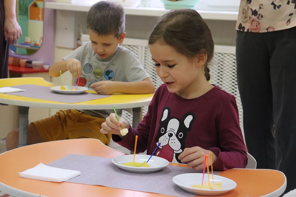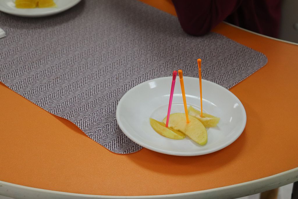несколько заданий: отгадать загадки про фрукты, определить на вкус , какой фрукт самый кислый (яблоко, лимон и апельсин заранее были разрезаны на тарелочки),