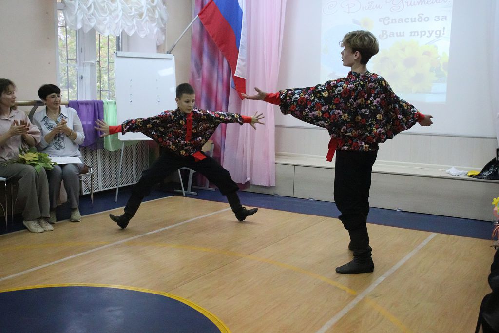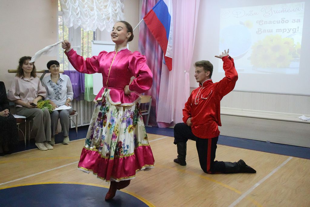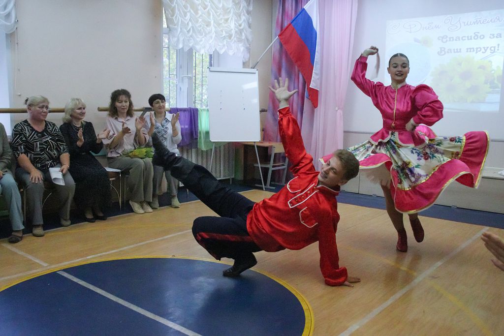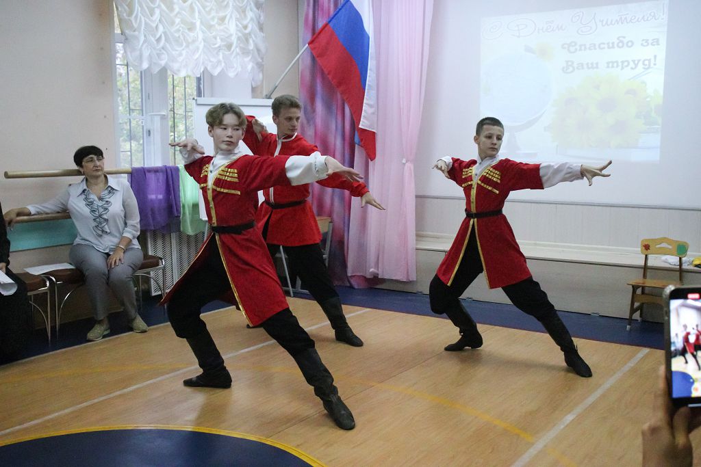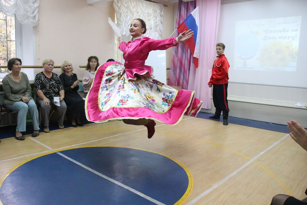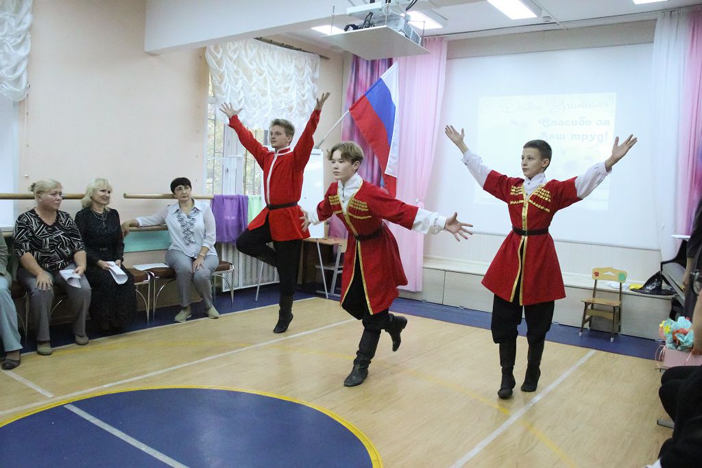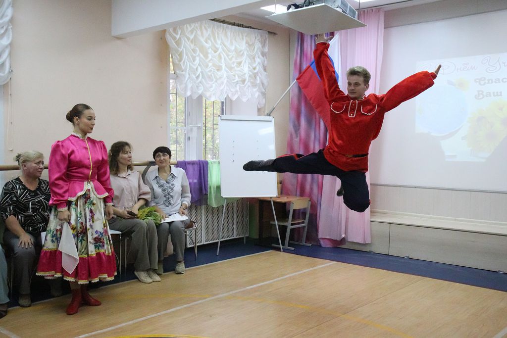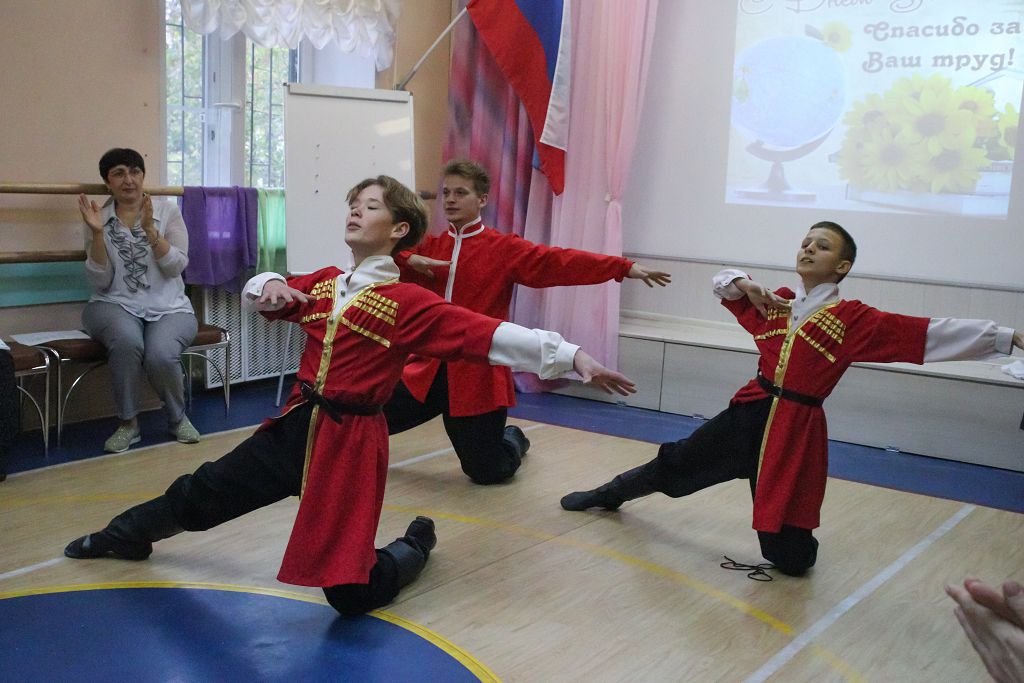 Она подготовила в этот день подарок учителям, для которых очень ярко выступили воспитанники ее ансамбля.