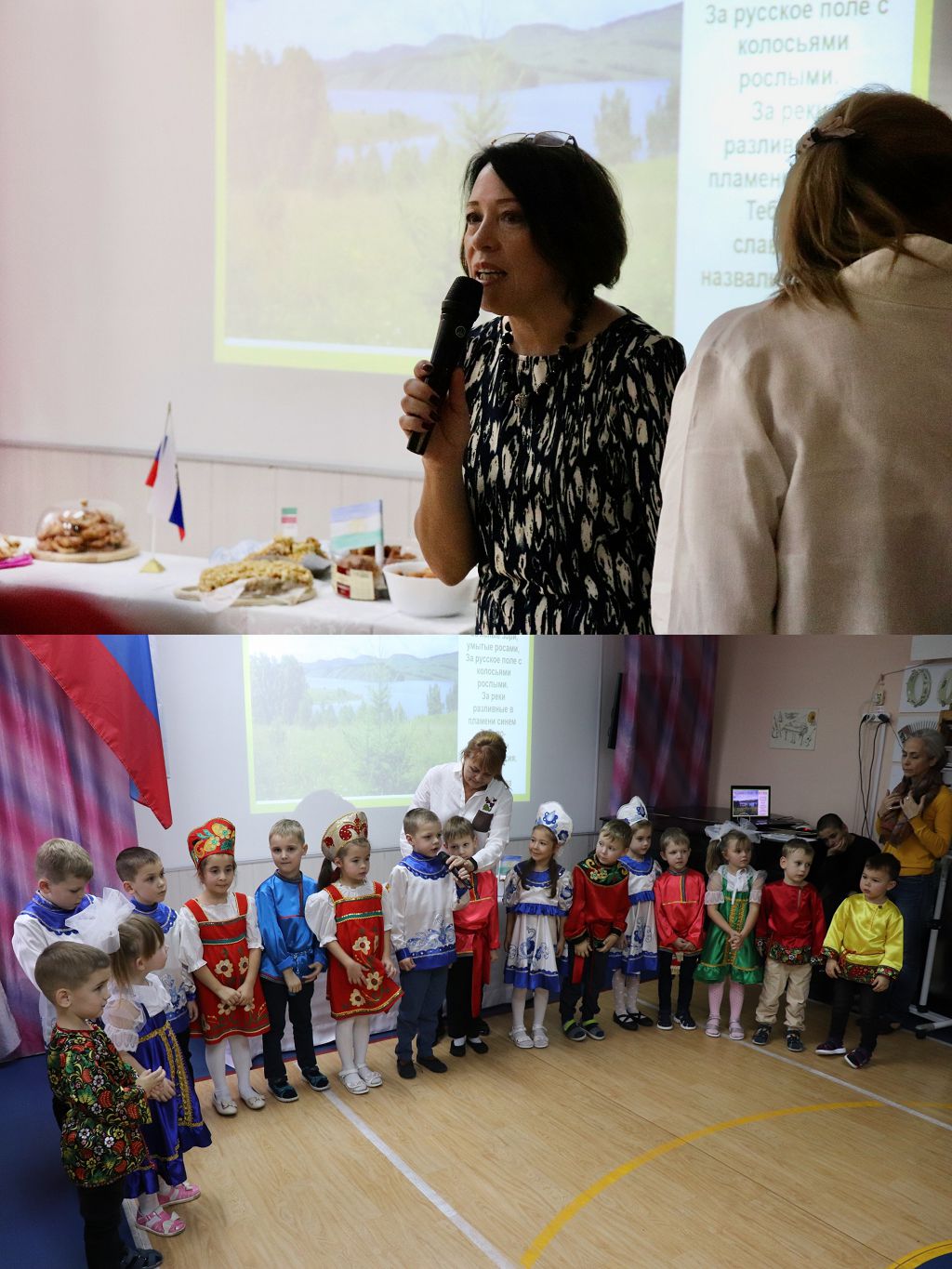 Завершили презентацию наши замечательные дошкольники, которые вышли в русских костюмах и вынесли красивый блинный пирог, прочитали стихи, спели задорную,