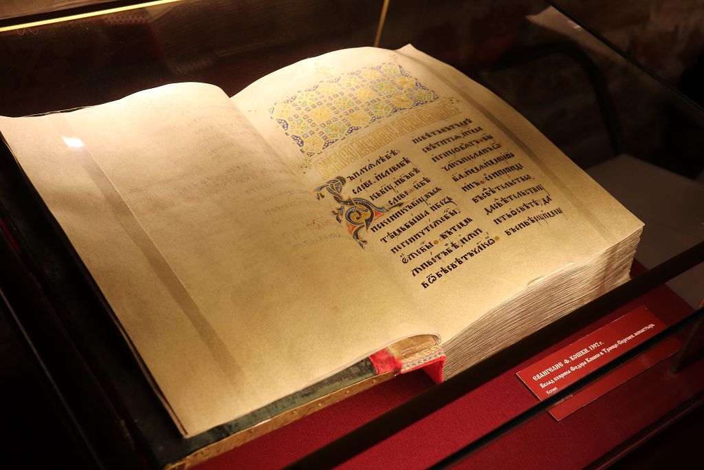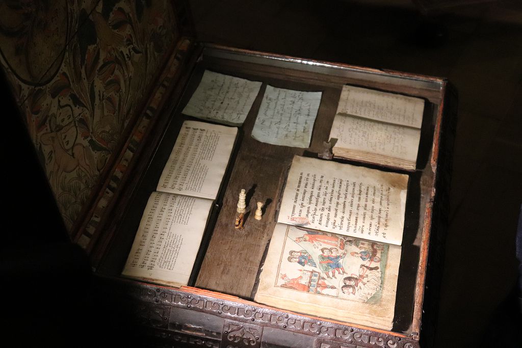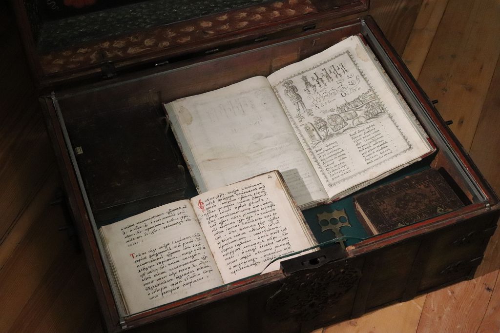 и рукописные книги (Евангелие, Азбуку, нотную книгу хорового распева), столовые приборы (оловянные тарели, дружину, именную чарку).